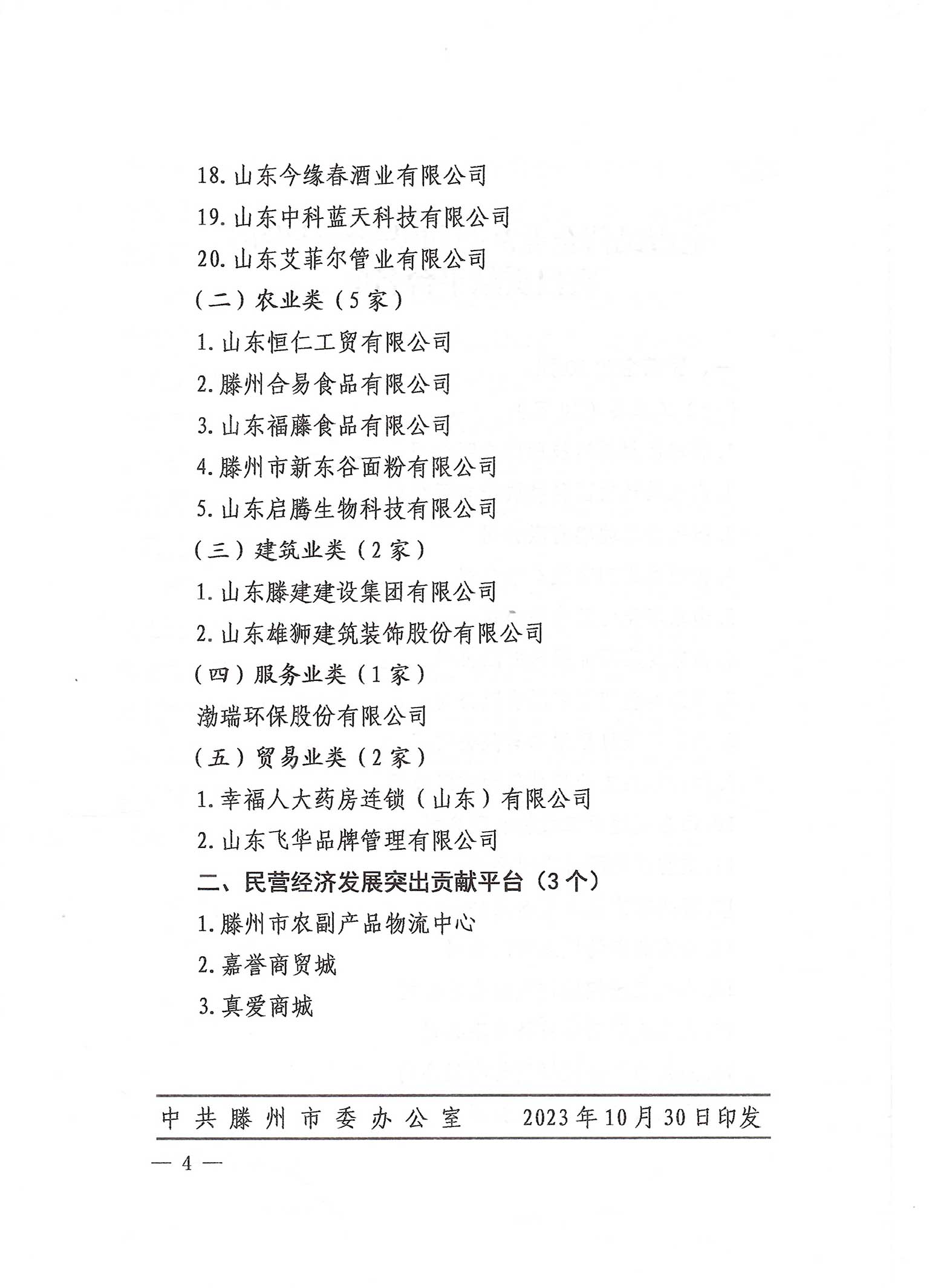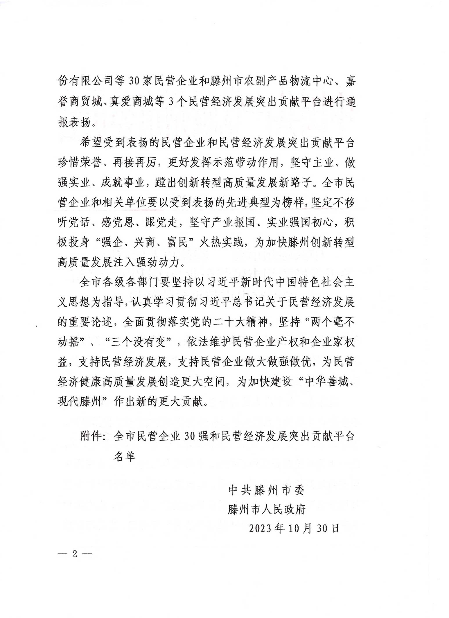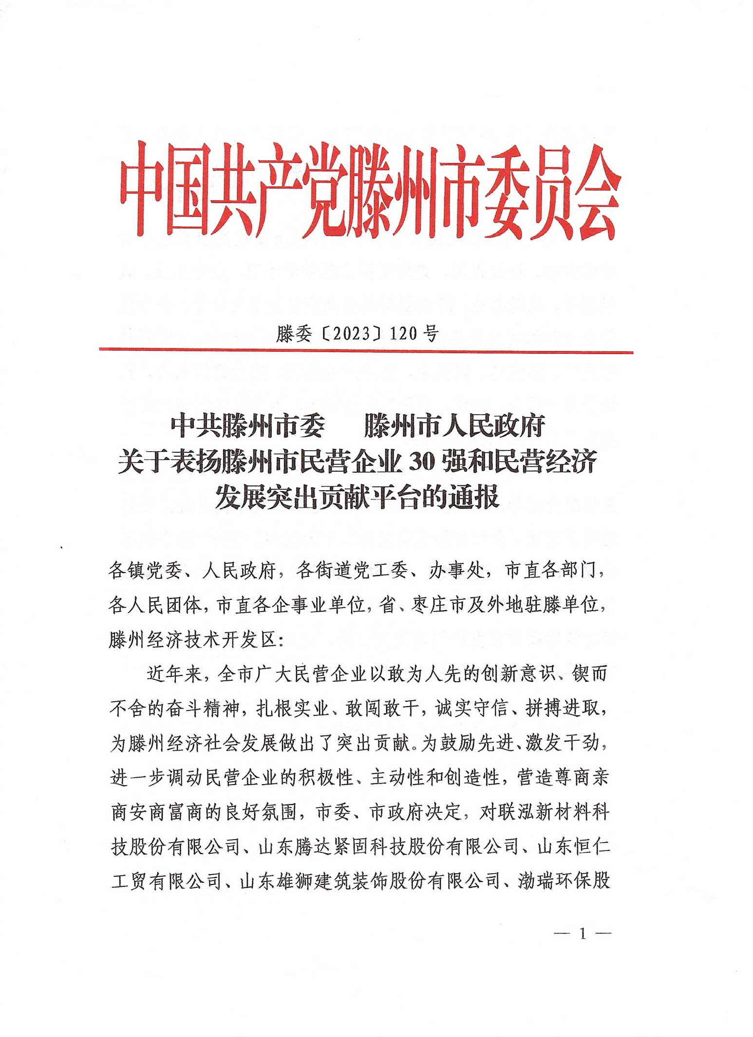 中共滕州市委 滕州市人民政府关于表扬滕州市委民营企业30强和民营经济发展突出贡献平台的通报