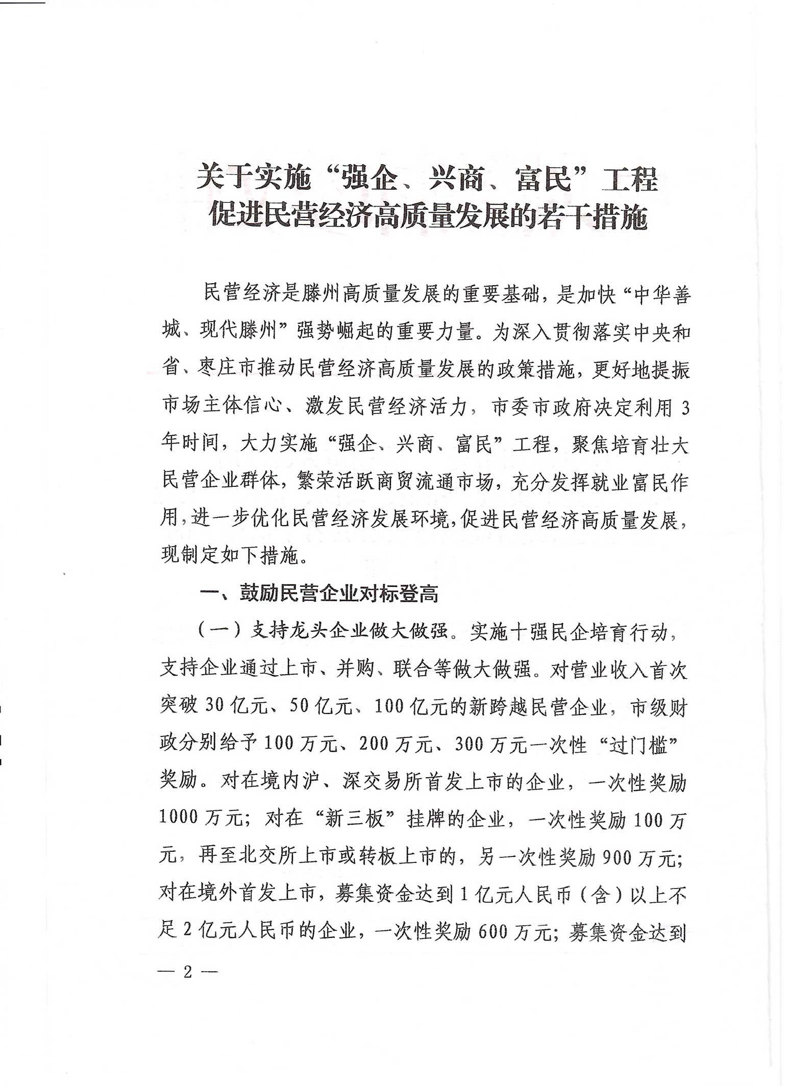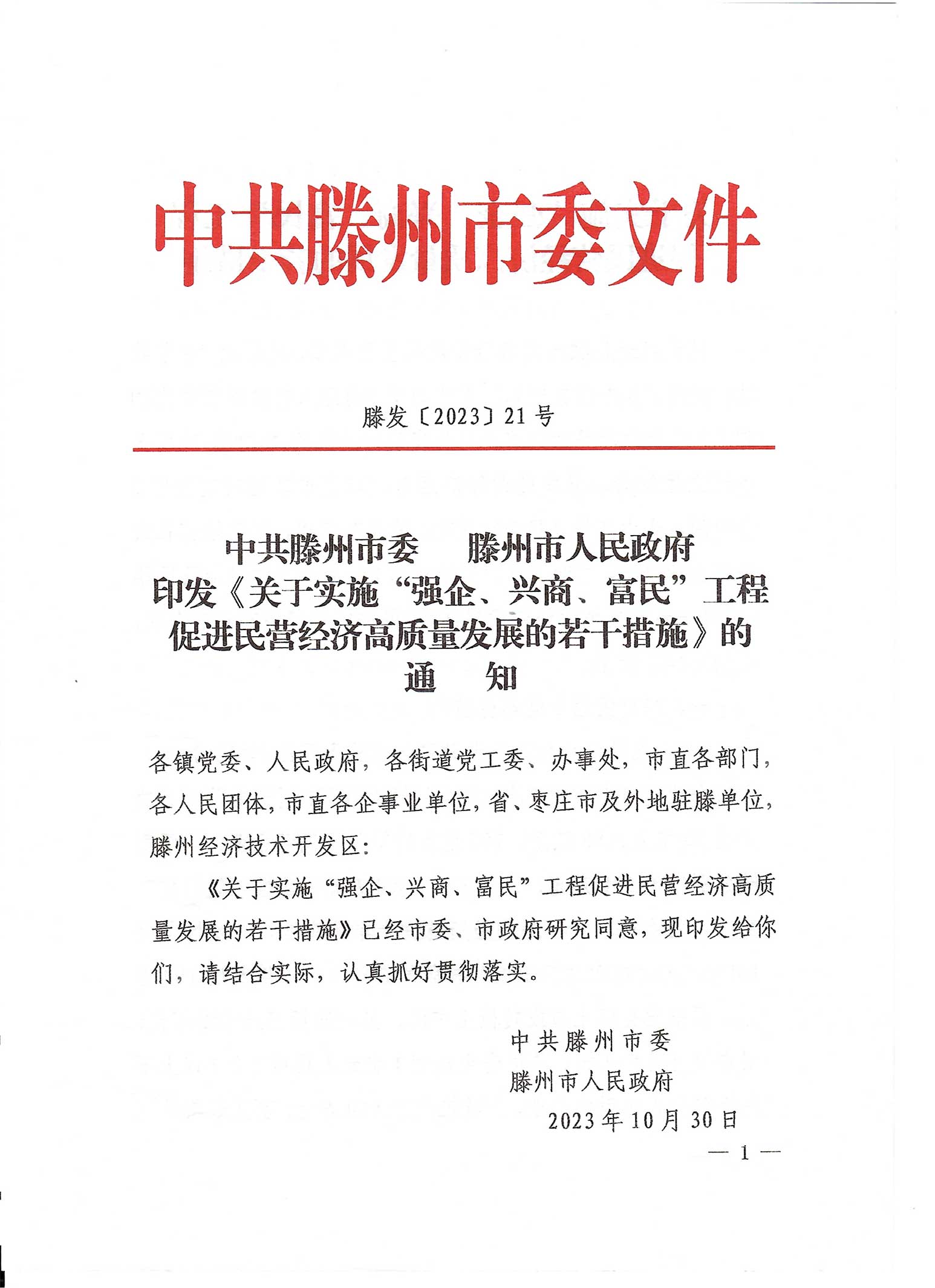 中共滕州市委-滕州市人民政府印发《关于实施“强企、兴商、富民”工程促进民营经济高质量发展的若干措施》的通知